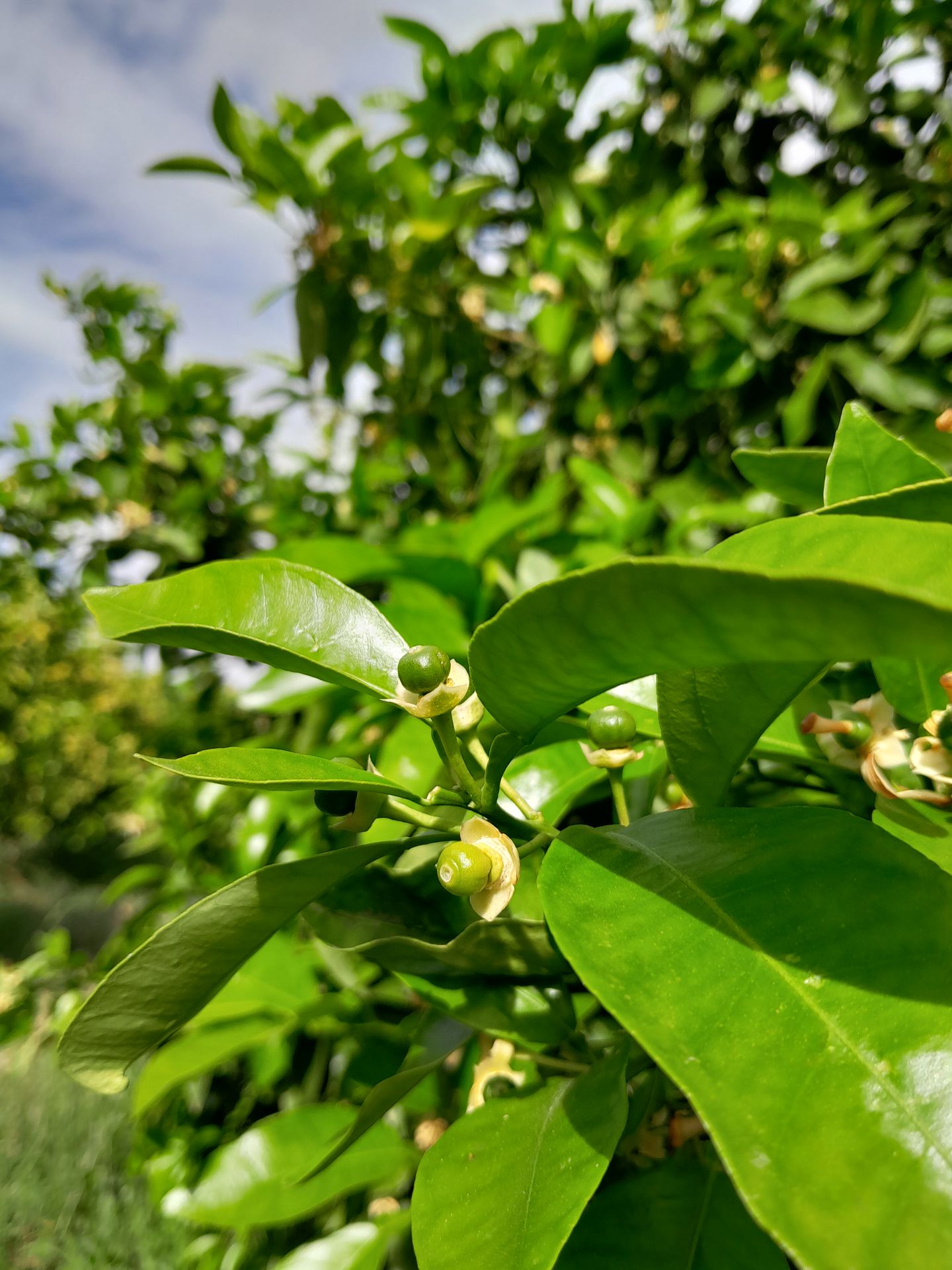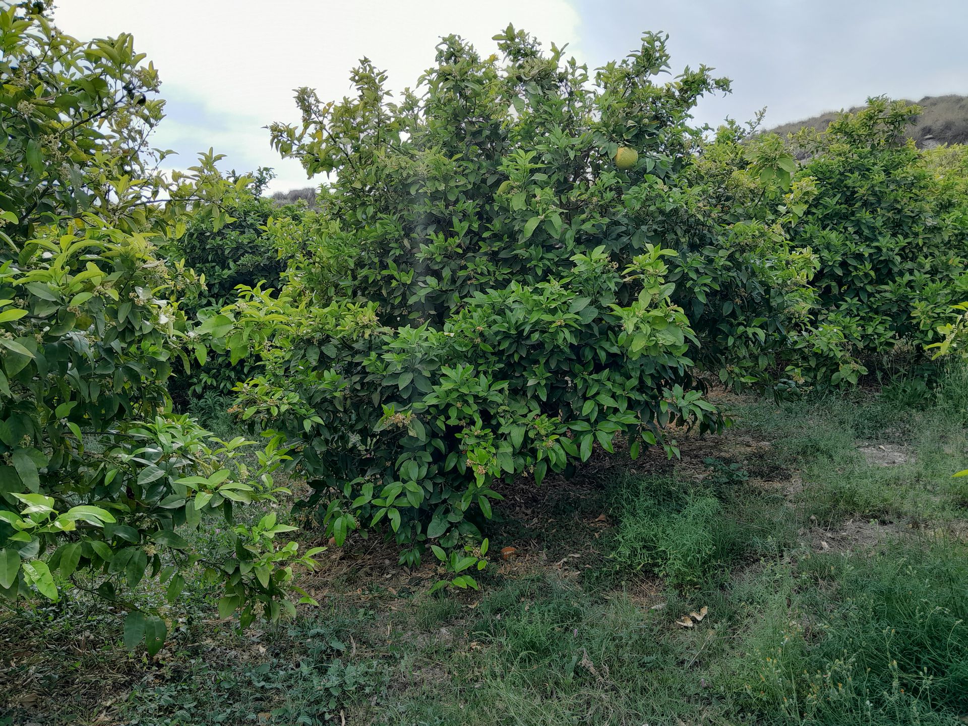 Verger de pamplemousses chez José, formation des fruits. La mise en place et la gestion d'un couvert végétal permettent de faire d'importantes économies d'eau.