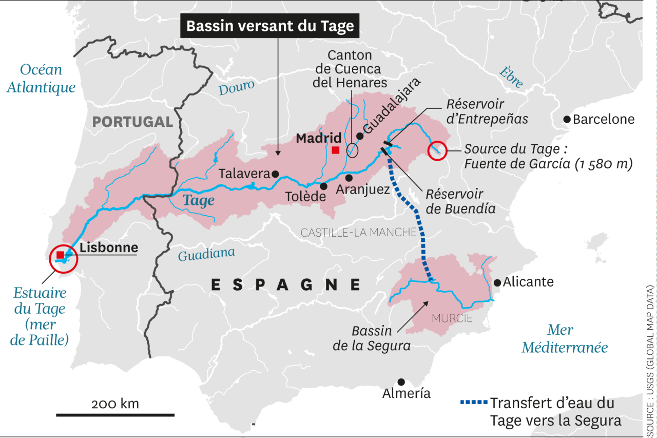 La sécheresse qui sévit en Espagne depuis plusieurs années est l’occasion de rappeler les politiques menées depuis les années 1960 pour apporter de l’eau des régions du nord, dites excédentaires, vers les régions déficitaires du sud est (Valence, Murcie et province andalouse d’Almería) où sont concentrées les cultures intensives de fruits et de légumes destinés au marché européen. Ces régions bénéficient d’un climat doux, ensoleillé mais sec, d’où la création d’infrastructures hydrauliques pour apporter de l’eau. C’est ainsi qu’un canal d’environ trois cents kilomètres relie les fleuves Tage et Segura pour assurer l’irrigation.