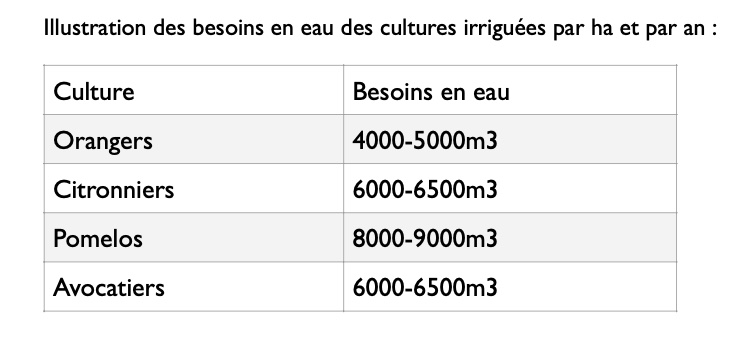 Autre stratégie : la diversité des cultures, d’autant plus importante dans une zone en manque d’eau. « Sur ma ferme, j’ai opté pour des goutteurs avec des débits différents afin de donner, sur un même temps d’irrigation, plus d’eau aux cultures qui ont un grand besoin comme les pomelos et moins aux cultures moins gourmandes comme les orangers », explique José. Le tableau ci-dessous donne une idée des besoins en eau des différentes cultures.