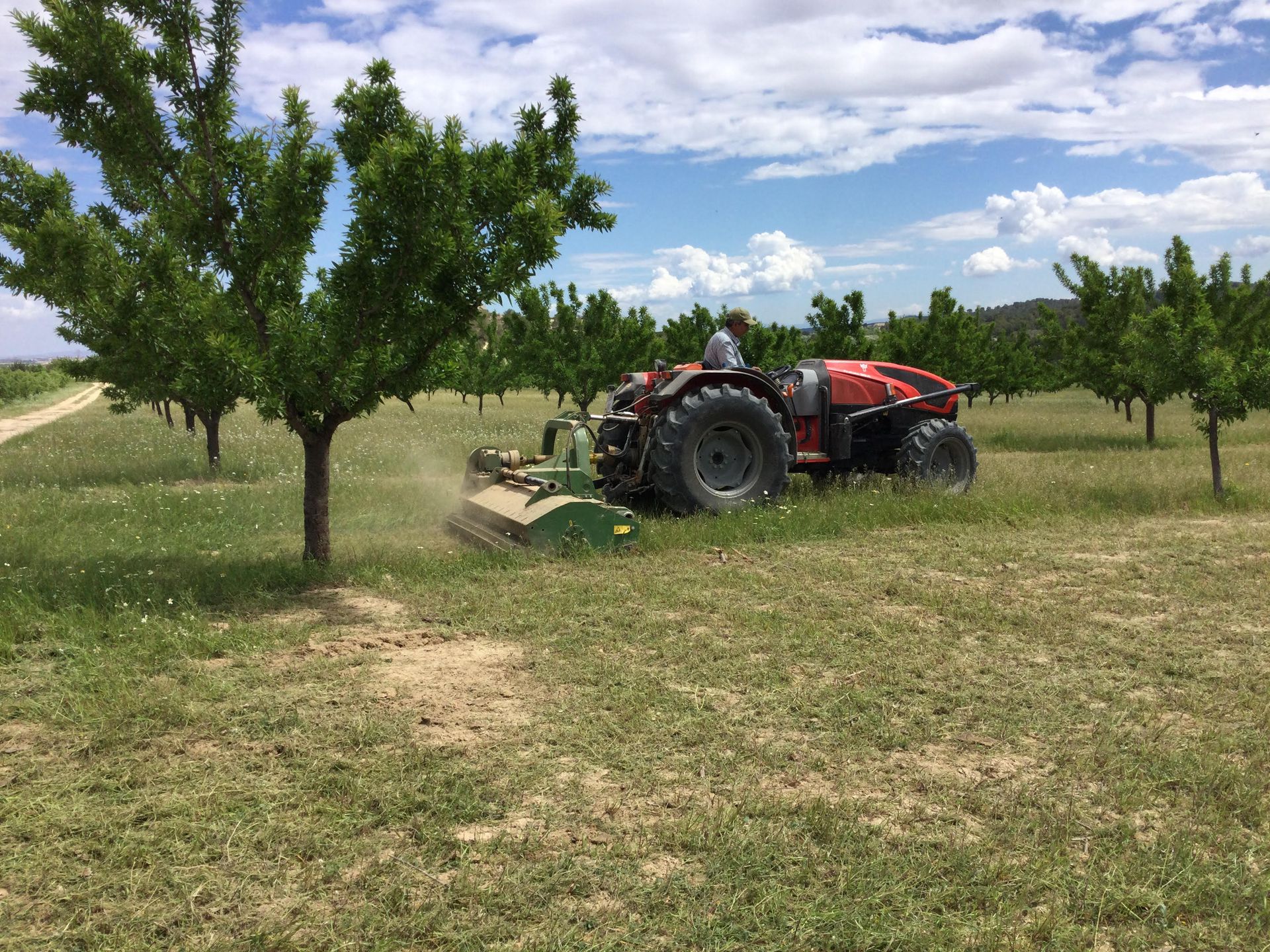 La taille a également débuté, notamment celle des mandariniers, sous les soins de Jesús et Juanito. Les orangers et citronniers suivront, ceux des variétés récoltées l'automne et l'hiver derniers. Par ailleurs, les pluies ont favorisé l'essai de couverts végétaux dans les parcelles d’amandiers de la famille Marín de la Alquibla. Ci-dessous, José, salarié de BioEspuña au tracteur.