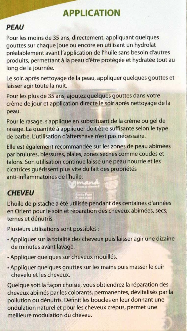 L'huile de pistache que nous proposons ici est à usage cosmétique. Elle est riche en vitamine E et cette teneur fait de cette huile un puissant anti-oxydant pour la peau face à l'action des radicaux libres. Elle hydrate, répare (notamment après une exposition au soleil), nourrit l'épiderme et apporte de la force aux cheveux.